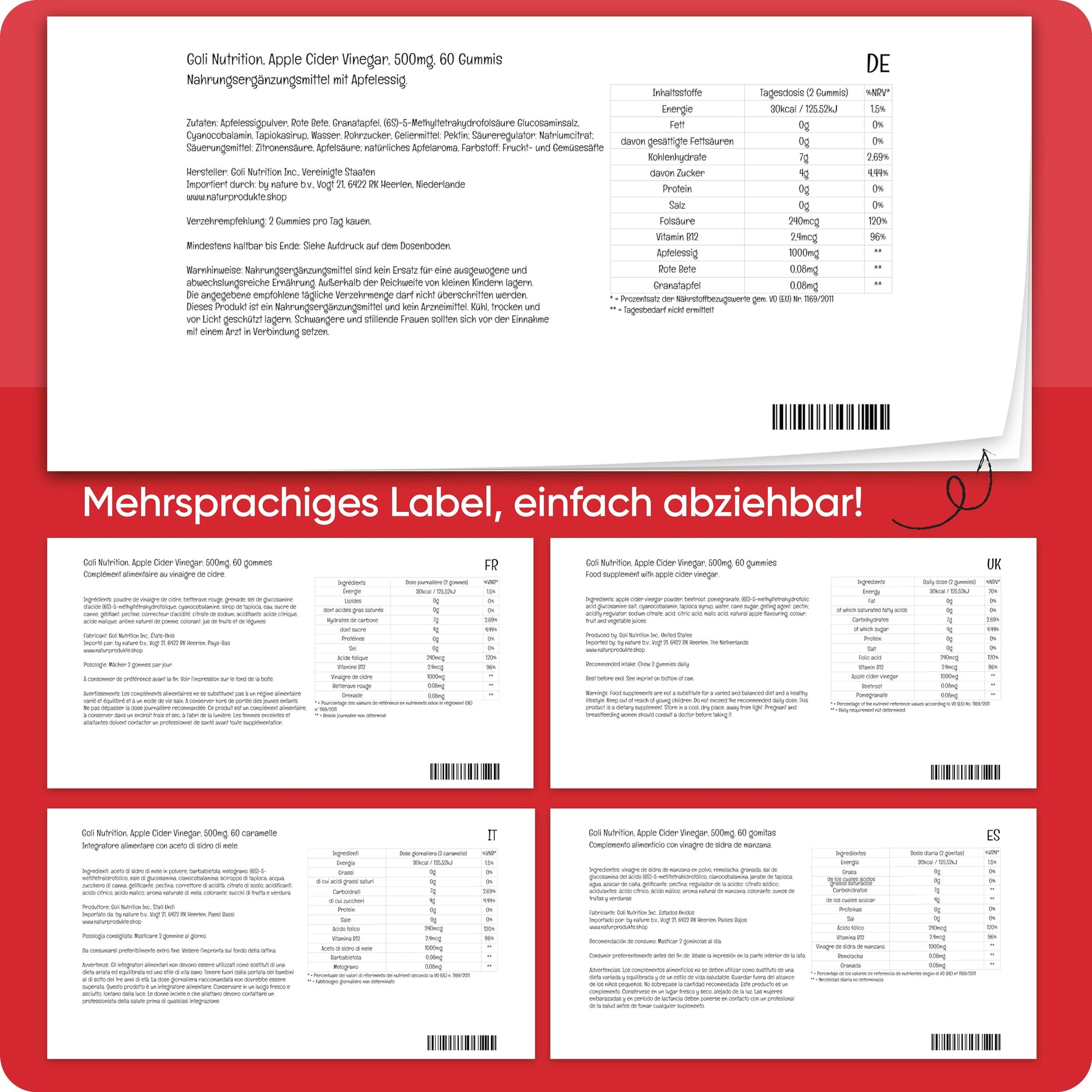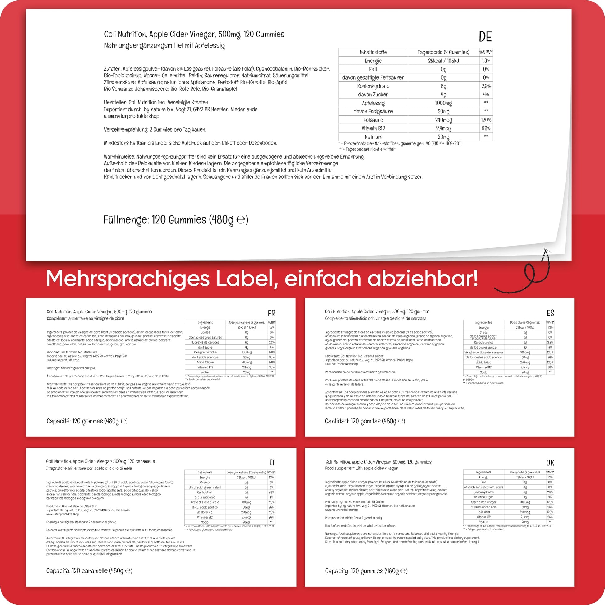 - 30 days supply: 60 Gummies Goli Nutrition Apple Cider Vinegar provide you with 30 days. With the intake of 2 gummies daily, you will receive 1000 mg of apple cider vinegar.