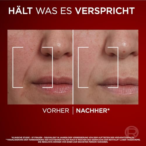 L'Oréal Paris Revitalift Laser Anti-Ageing Day Cream presents an advanced formula for visibly smoothing and firming the skin. This care is a light, fast absorbing and non-greasy option for daily use. A triple power combination of active ingredients is at the heart of this anti-age care: pro-retinol softens wrinkles and fine lines. Hyaluronic acid intensively moisturises the skin, resulting in plumping and improved suppleness. The vitamin C helps to improve the skin's natural radiance and supports a more even, fresher complexion. In addition, Argireline peptides are integrated, which help to relax facial features and reduce the appearance of wrinkles. The day cream supports the natural renewal of the skin structure, which makes the skin look smoother and more elastic. It provides intensive moisture that plumps the skin and gives it a youthful freshness. The radiance of the skin is visibly improved and unevenness is gently balanced, resulting in a flawless and even complexion. For best results, use in the morning on cleansed face and neck in gently ascending movements is recommended.