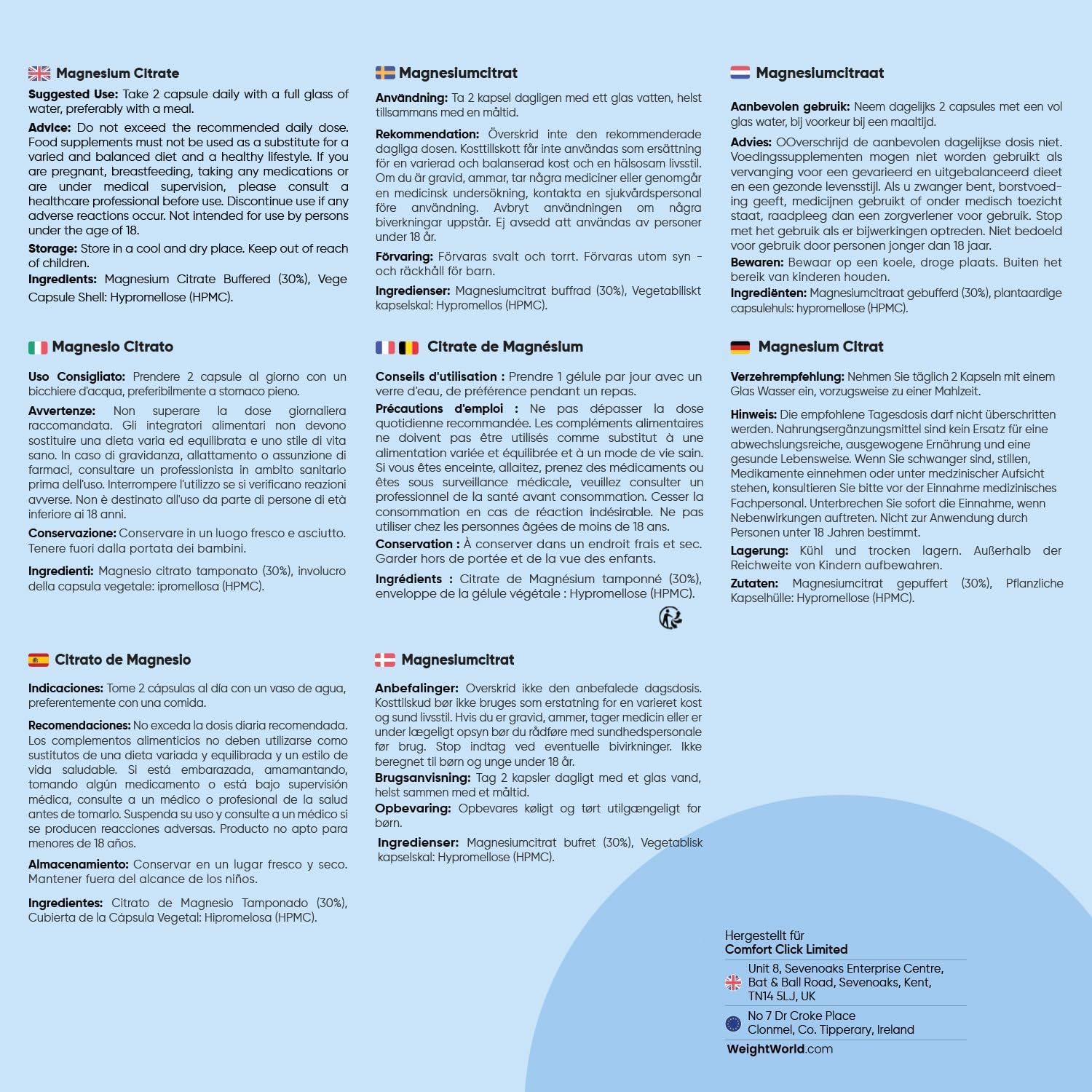 Magnesium Citrate Buffered - 240 Vegan Capsules - 444mg Elemental Magnesium Per Serving - 4 Months Supply - Magnesium Citrate Capsules - Alternative to Tablets or Powder - by WeightWorld