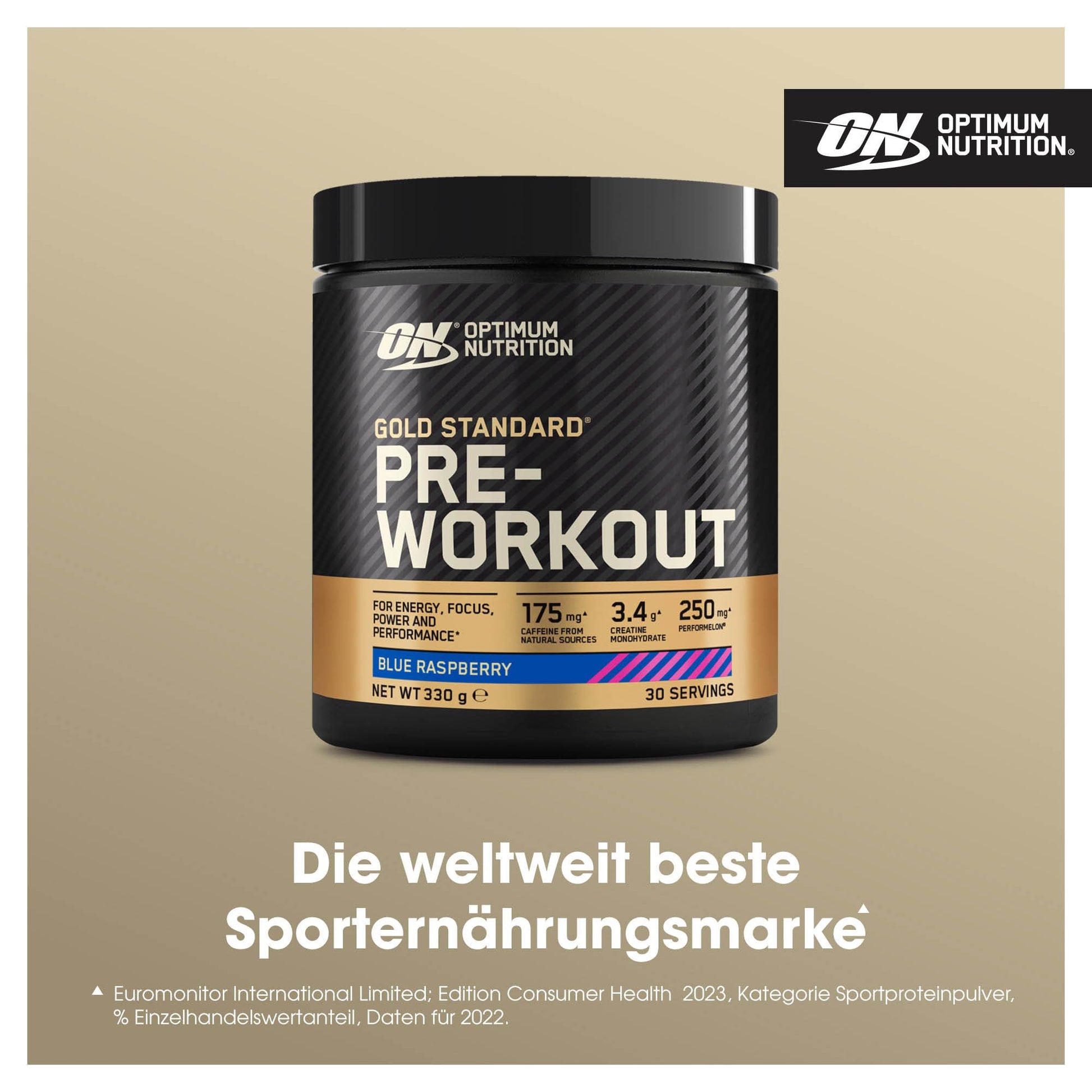Entdecke Optimum Nutrition Gold Standard Pre Workout Powder. Dieser mischfertige Energydrink wurde entwickelt, um deine Konzentration, Kraft und Leistung* vor und während des Trainings zu verbessern. ON Gold Standard Nahrungsergänzungsmittel ist Informed Choice-zertifiziert und enthält eine sorgfältig ausgewählte Liste von Inhaltsstoffen. Es enthält 175 mg Koffein aus natürlichen Quellen, um die Wachsamkeit und Konzentration vor dem Training zu steigern*. Jede Portion enthält 3,4 g Kreatinmonohydrat, das deine Kraft und Leistung unterstützt. Dieses leckere Sportgetränk enthält außerdem die Vitamine B 1, B 3, B 5, B 6 und B 12, die alle zu einem normalen energiereichen Stoffwechsel beitragen**. Darüber hinaus enthält es Beta-Alanin (Carnosyn), Citrullin, L-Carnitin und N-Acetyl-Tyrosin. Eine Vielzahl von Geschmacksrichtungen - Fruchtpunsch, Saurer Apfel, Wassermelone, Himbeere und Kiwi - bedeutet, dass du für Energie, Fokus und Leistungssteigerung keine Abstriche beim Geschmack machen musst. Das Pre-Workout-Supplement ist für jeden geeignet: von denjenigen, die gerade erst anfangen, einen gesünderen Lebensstil zu führen, bis hin zu Sportlern, hart arbeitenden Studenten, Berufstätigen und Fitnessliebhabern. Optimum Nutrition Gold Standard Pre Workout Powder ist ein schmackhafter Muntermacher, der die Geldbörse nicht sprengt und jederzeit und überall genossen werden kann - zu Hause, unterwegs oder im Fitnessstudio. Um einen leckeren Shake zuzubereiten, füge 1 gestrichenen Messlöffel zu 350 ml kaltem Wasser hinzu. Mixen und servieren. *Quelle: EFSA Journal 2011;9(4):2054 24 **Quelle: VERORDNUNG DER EU-KOMMISSION Nr. 432/2012