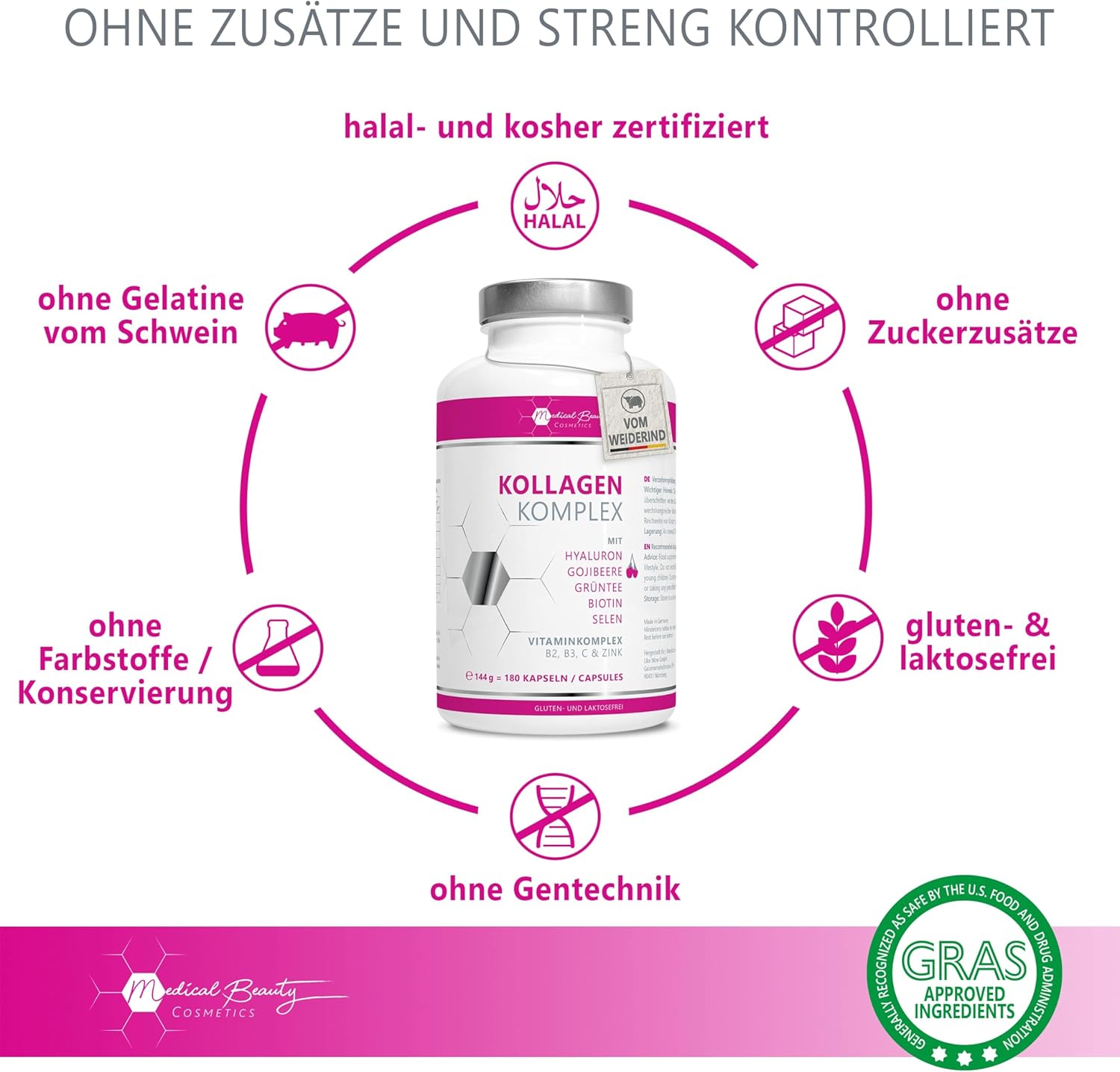 - ✅ NATÜRLICH FREI VON ZUSÄTZEN – Kollagen Hyaluron Kapseln ohne Zuckerzusätze, Aromen oder Konservierungsmittel, Gentechnik-, gluten- und laktosefrei. Ohne Tierversuche.