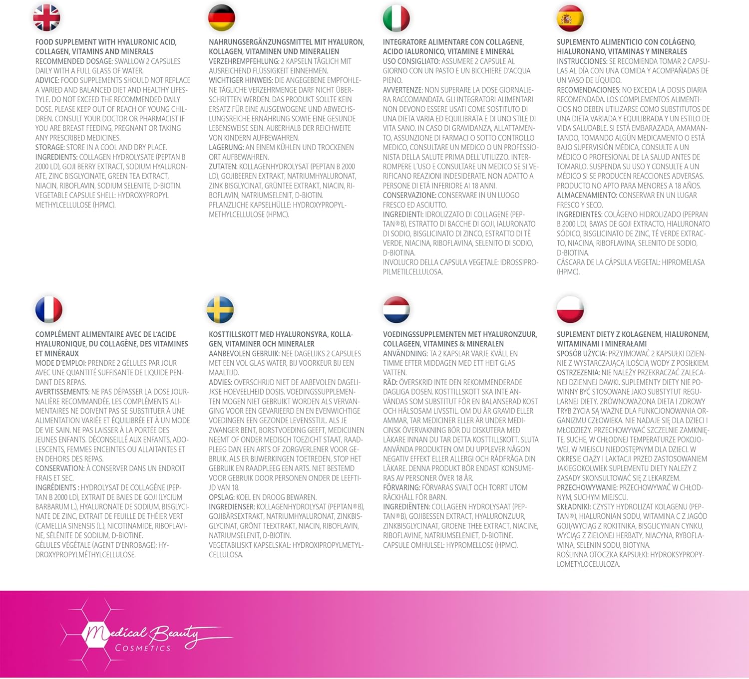 | Zusatzstoffe | Hochdosiertes Hyaluron, Biotin, Zink (Zinkbsglycinat), Vitamin C (natürlich aus der Gojibeere), Vitamin B2, Vitamin B3 Mehr anzeigen |