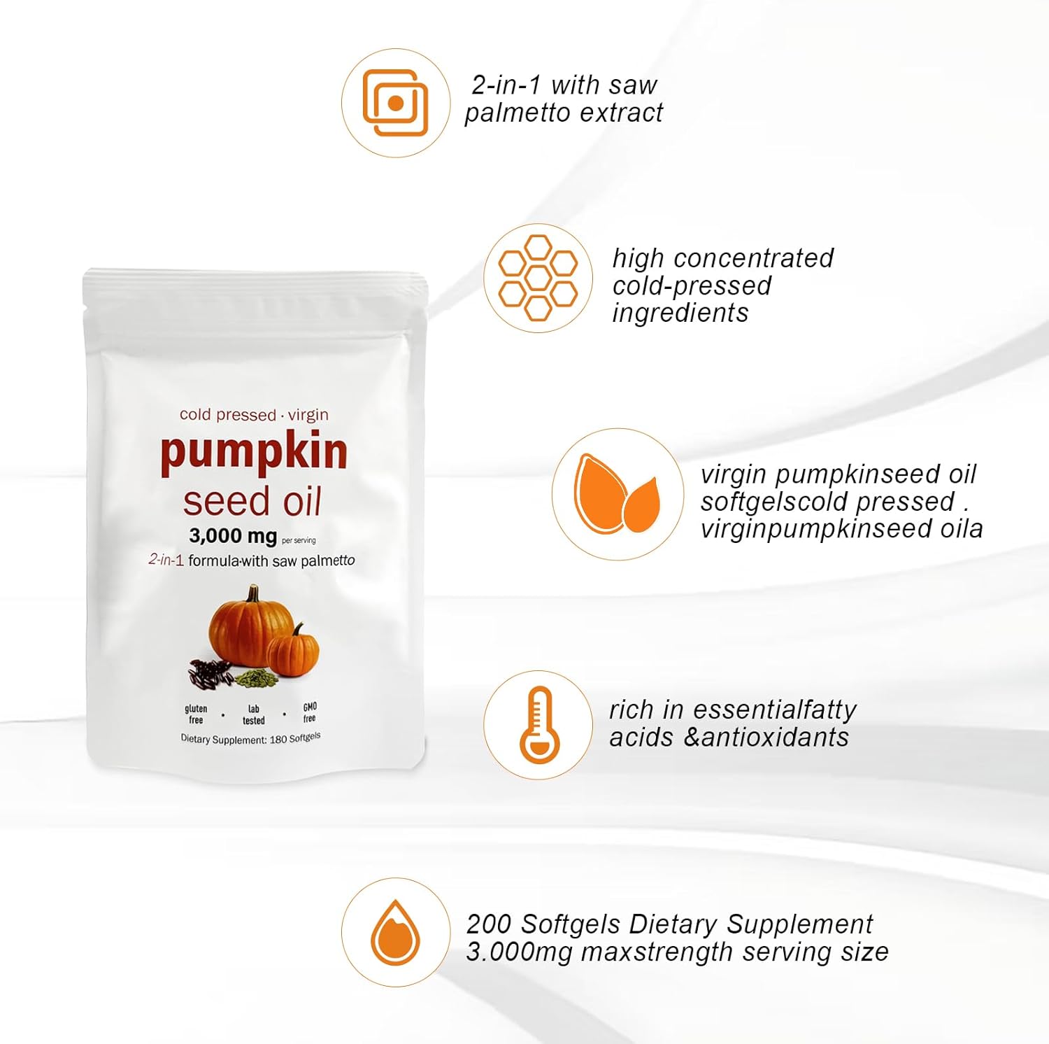 - Introducing premium high-concentration virgin pumpkin seed oil softgels, expertly formulated with a cold-pressed 2-in-1 complex that includes saw palmetto extract. This unique blend is designed to retain essential fatty acids, phytosterols, and antioxidants, ensuring maximum potency and health benefits.