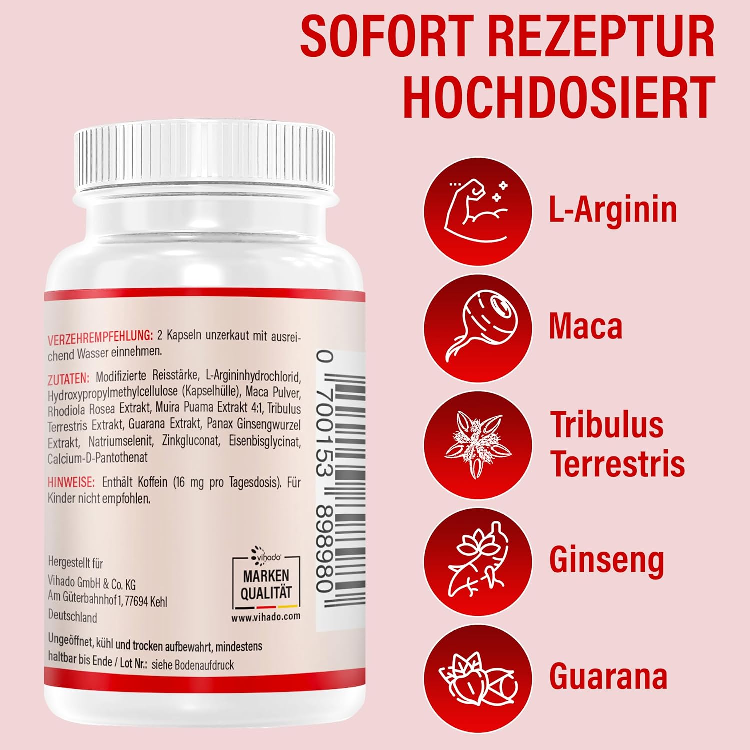 Vihado 4MEN direct 2.0 - this is a brand new dietary supplement, without a prescription. Developed as an improved version 2.0 extra strong! Direct means immediately and quickly, because the capsules have it all. They have been specially designed for the needs of men. With the proven ingredients guarana (natural caffeine), L-arginine, maca, tribulus terrestris, ginseng. In addition, zinc, selenium, iron, vitamin B5, rhodiola rosea extract and muira puama extract. A unique package for targeted, individual intake in addition to the Vihado 4MEN (blue). Vihado 4MEN direct 2.0 - there when you need it.